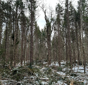 Auf durchgefrorenem Boden wird in New Brunswick die erste Winterernte durch den neuen Forstmanager Acfor durchgeführt. Ziel ist die großzügige Hochdurchforstung der (Nadelholz)-Bestände an Balsamfire und Spruce, die bereits instabil und gefährdet sind. Fünf Habitat-Bäume je Hektar (Baumstümpfe, Wolf-Trees und/oder Bäume mit großem Durchmesser) werden geschützt. Totholz wird großzügig im Wald belassen. So werden Ansätze von Biotop-Verbundsystemen auch in Atlantik-Kanada implementiert.
